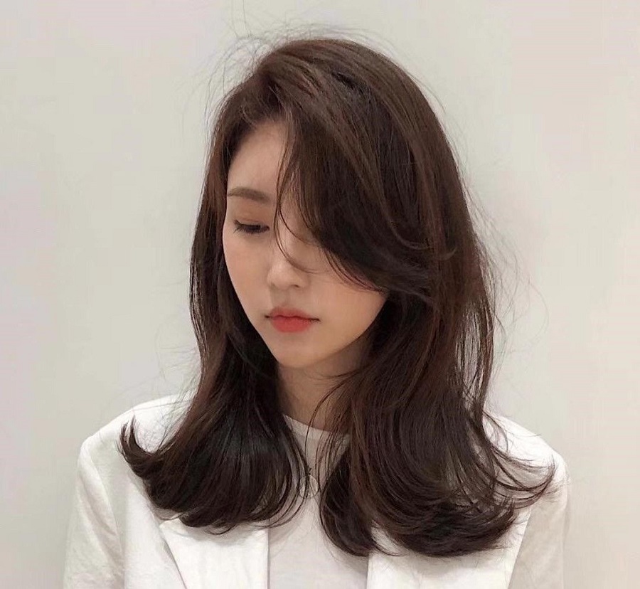 Với kiểu tóc này, bạn chỉ cần uốn cong phần tóc mái, phần tóc còn lại có thể uốn xoăn hoặc xoăn lơi nhẹ. Kiểu tóc mái xéo uốn nhẹ sẽ phù hợp với các bạn nữ mang phong cách nữ tính, điệu đà.